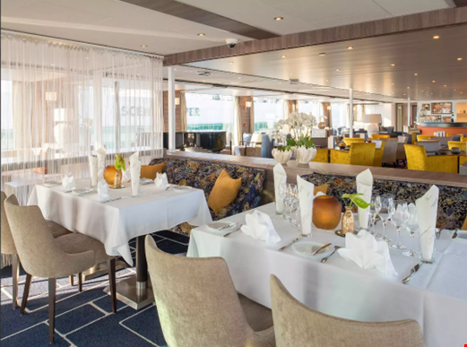 Από τη στιγμή που θα μπείτε στο εστιατόριο του πλοίου σας, να είστε προετοιμασμένοι για μια γευστική εμπειρία που θα ευχαριστήσει όλες τις αισθήσεις σας. Ο χαλαρός αλλά κομψός ενδυματολογικός κώδικας εξασφαλίζει ότι θα απολαύσετε ευχάριστες στιγμές σε ένα πανέμορφο περιβάλλον, ενώ η γαστρονομική ομάδα μας ετοιμάζει μια επιλογή από εξαιρετικά πιάτα χρησιμοποιώντας μόνο τα καλύτερα και πιο φρέσκα υλικά. Με κάθε γεύμα το βράδυ προσφέρονται δωρεάν κρασιά ποιότητας από τις καλύτερες αμπελουργικές περιοχές της Ευρώπης.